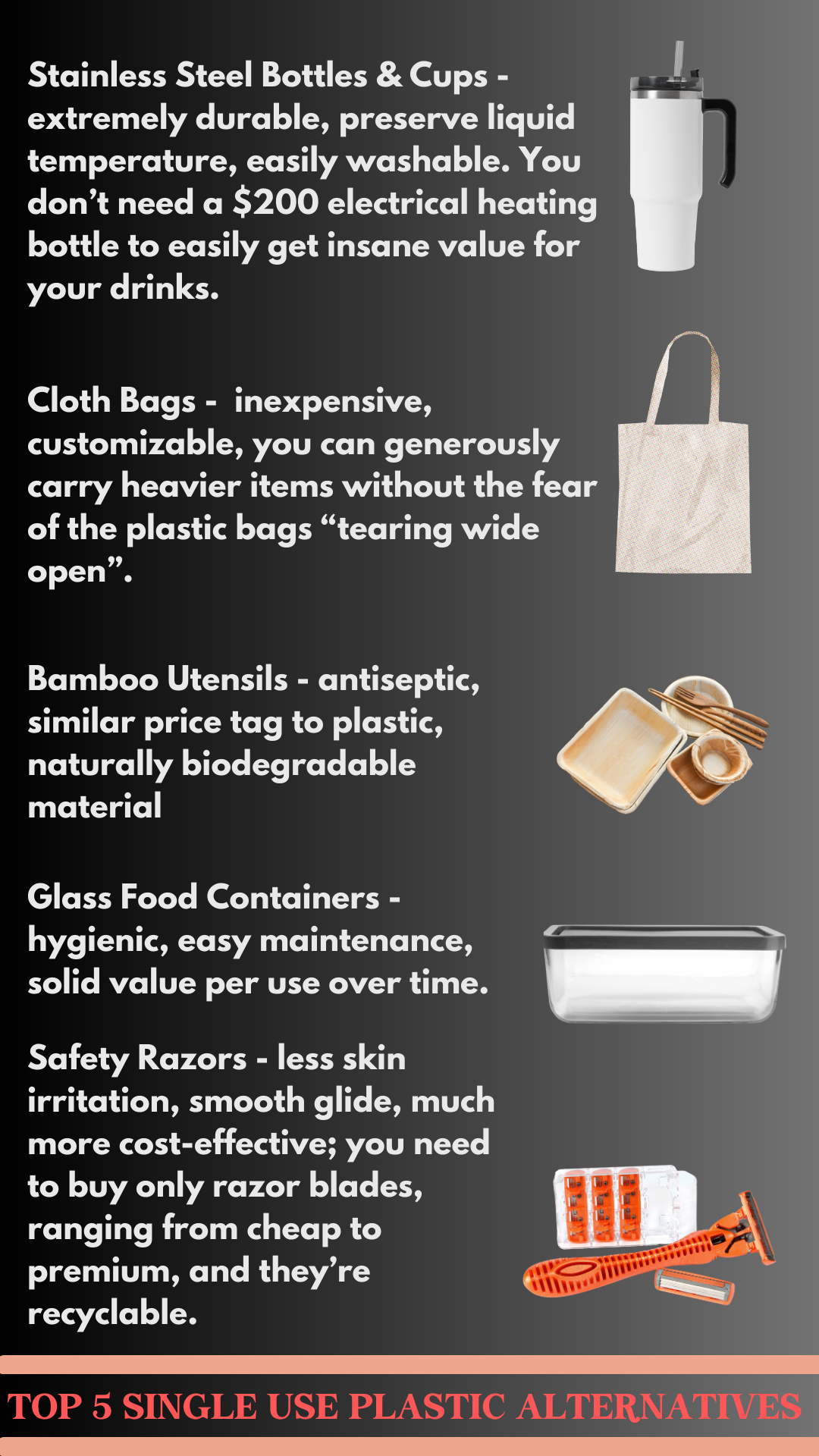 Think clearly for a brief second: Even your local store now charges for plastic bags that are probably going to bust open halfway home.